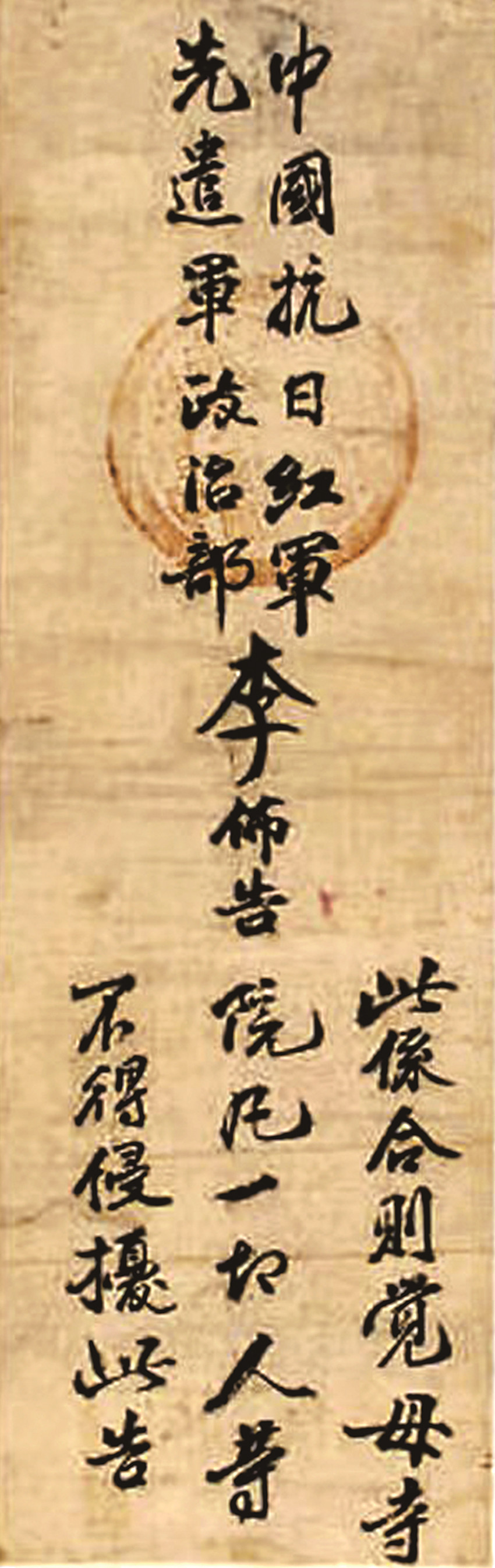 1936年2月,為執(zhí)行紅軍總部的《康道爐戰(zhàn)役計(jì)劃》,以劉伯承為中國(guó)抗日紅軍先遣軍司令員的紅30軍從雅安寶興翻越夾金山西進(jìn),經(jīng)懋功、金湯、丹巴,攻取道孚、爐霍、甘孜地區(qū)。3月1日,紅30軍攻占道孚,25日,攻占爐霍,30日進(jìn)駐甘孜縣。紅30軍來到甘孜縣合則覺母寺院附近,為打開當(dāng)?shù)氐木置?,紅軍堅(jiān)決執(zhí)行紀(jì)律,不干擾百姓。中國(guó)抗日紅軍先遣軍政治部以軍政委李先念的名義,頒布了保護(hù)覺母寺(尼姑庵)的布告。布告說“此系合則覺母寺院,凡一切人等不得侵?jǐn)_,此告”。