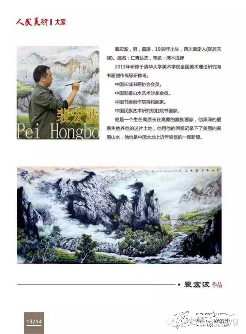 《人民美術(shù)》是中國最具權(quán)威的美術(shù)雜志、國家核心美術(shù)雜志和美術(shù)界最高學(xué)術(shù)雜志,由《人民日報(bào)》社主管。雜志社對裴宏波及其作品給予了高度評價(jià),認(rèn)為藏族畫家裴宏波的作品極具生命力,在中國美術(shù)史上又有了新的突破,富有民族性、地域性、創(chuàng)造性、歷史性,最終決定列選為中國大家。雜志中裴宏波排在劉大為、曹雕、劉文西等之后。