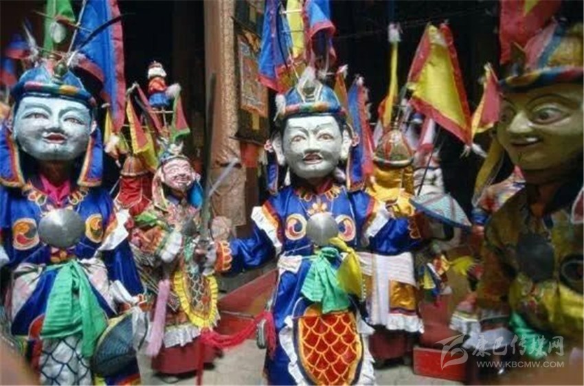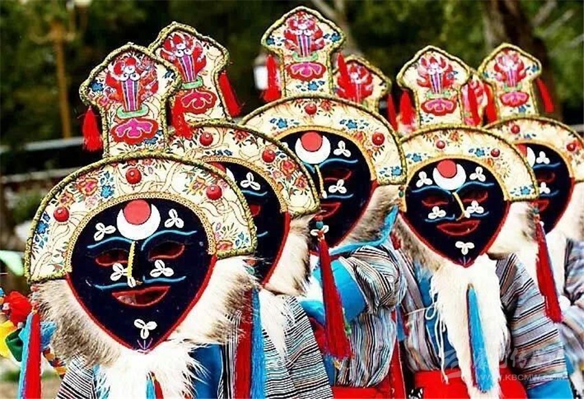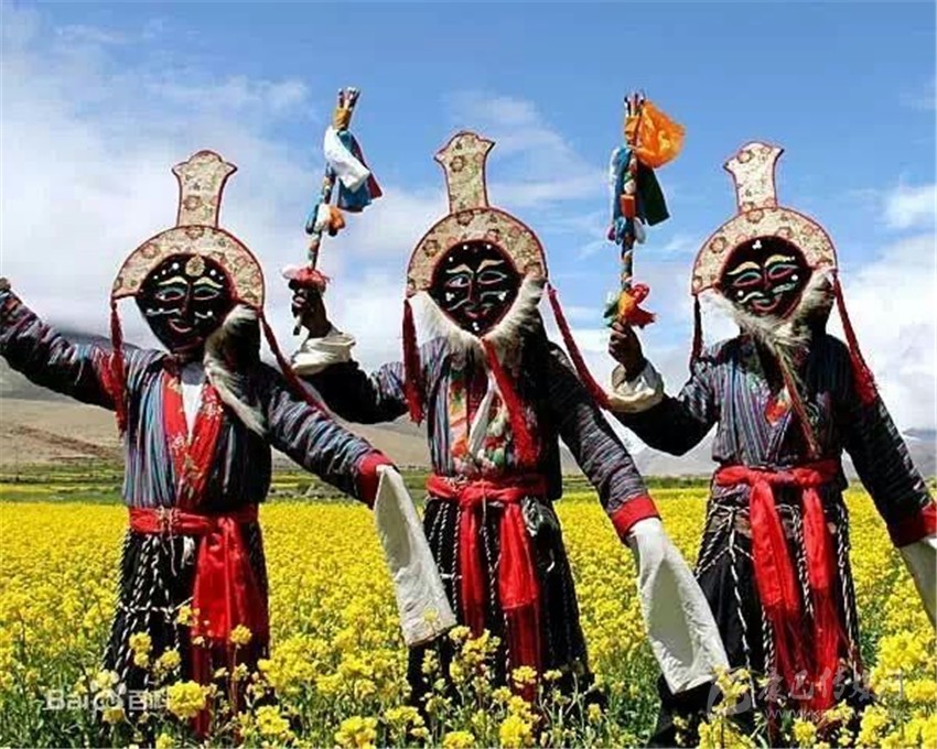 第三部分,被稱為“扎西學(xué)”。頭戴白羊皮面具,面部呈黃色的演員們是吉祥老人的化身。他們雖然老態(tài)龍鐘,但動(dòng)作卻輕盈無(wú)比。其裝束除了腰間纏繞的“子體”未掛五色彩綢外,與“溫巴”別無(wú)二致。他們?cè)跉g樂(lè)的舞動(dòng),向眾人賜福吉祥。