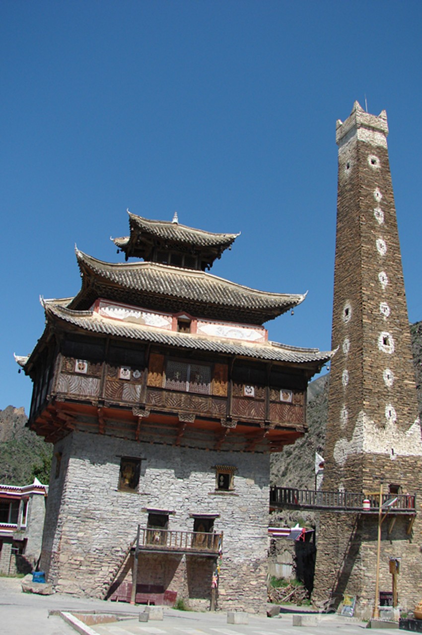 站在廣場中央仰望,碉樓有十五層高,約有二十余米,其外墻為片石壘砌,并附建有經(jīng)堂碉及過街樓,防御性極強。整座碉樓在修建中,層層收分,從墻面往上看,傾斜面在八十度左右。到達碉樓頂,面積只有四平米左右,在每一層樓里,都有外窄內(nèi)寬的窗戶,是典型的堡壘式射擊孔。在通往碉樓頂?shù)拿恳粚臃块g內(nèi),都有一根獨木梯連接著。第一層為石材壘筑的實心體,這種建筑方式為碉樓下大上小、重心向內(nèi)、穩(wěn)定性強的特點奠定了牢固的基礎(chǔ)。碉樓內(nèi),水源路網(wǎng)環(huán)環(huán)相通,倉儲空間很大。第二層為放置日常用品的地方,房門開在第三層,連接地面的依然是一根獨木梯,若遇敵人來犯時,人們便從獨木梯上攀援而上,再將獨木梯抽取。這樣,一座碉樓就固若金湯,只需從射擊孔中射出箭,或者從碉樓頂?shù)乃慕侨酉乱粔K塊巨石,不管敵人是如何的孔武有力,還是擁有如何的謀略,在碉樓面前都會束手無策,最后只能選取最原始的進攻方法——圍而不攻。坐待碉樓里的人彈盡糧絕之日,不過,人們在修建碉樓時,已充分的考慮了這些因素,在每一層樓里都儲備了足夠幾年之需的食物和水,這樣,往往是圍攻的人耐不住性子,最后只好悻悻然退卻。