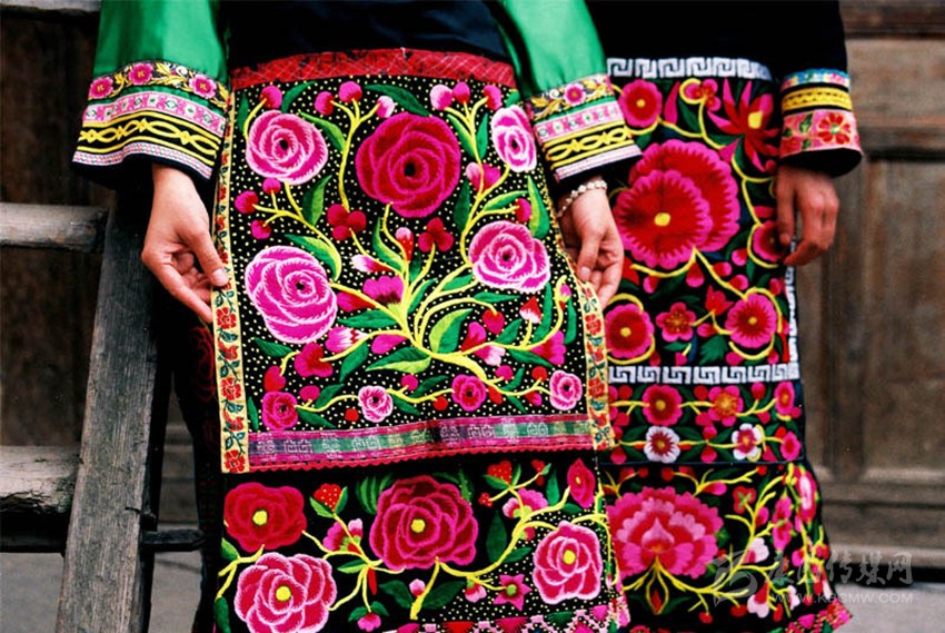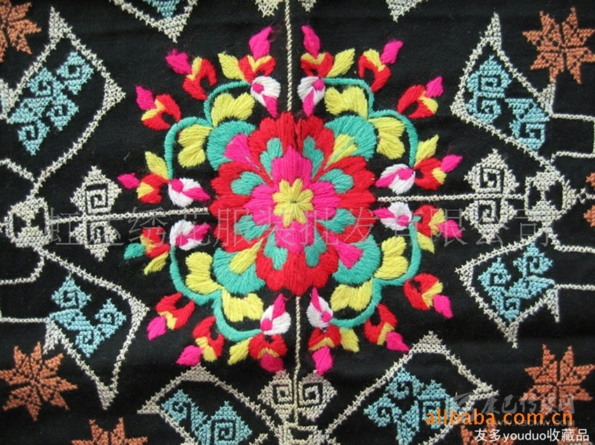 在這里,婦女們猶愛(ài)花草。所以,他們的刺繡作品,有生活的細(xì)節(jié)滲透,如氣息,若有似無(wú),相互浸潤(rùn)。無(wú)論是花蔓纏枝,還是朵花團(tuán)簇,都從生活中提煉,視之便信手拈來(lái),放在青布黑衫之上,鮮艷奪目,張顯著生活在這方水土之上,人們獨(dú)特的審美情趣。