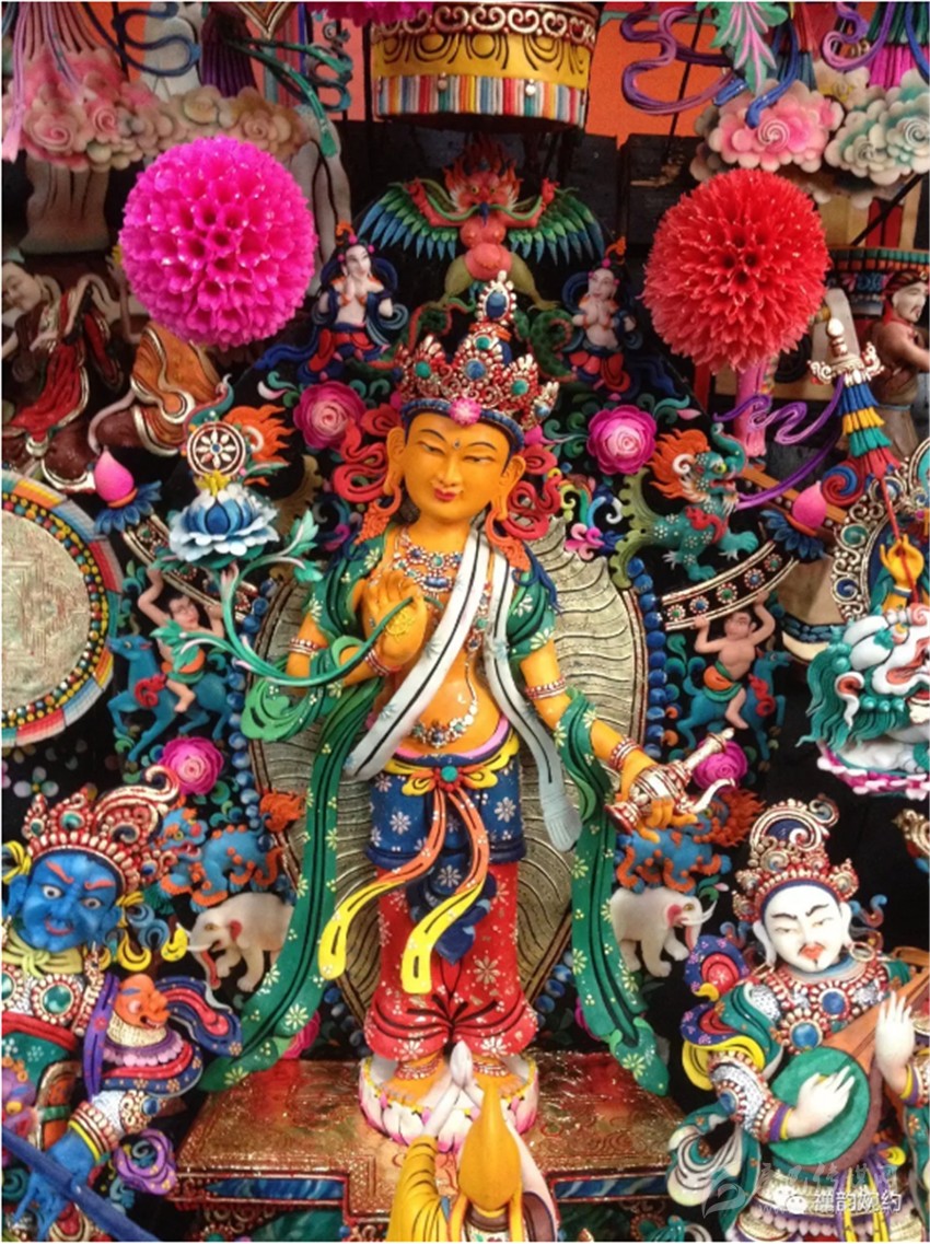 有傳說稱641年文成公主進藏,帶去一尊釋迦牟尼12歲等身像并將其供奉于拉薩的大昭寺,當地群眾用酥油做成花供獻于佛前,以示崇敬之心,后各藏傳佛教寺院相繼使用,視為禮佛珍品,獻酥油花遂成為正月祈愿大法會的重要內容。在發(fā)展過程中,酥油花的塑造方式、花色品種、內容題材和工藝技巧都不斷發(fā)生著變化。