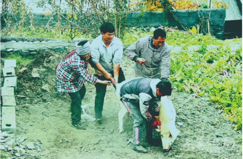 殺年豬是三埡人過年的重頭戲。清晨,家家戶戶的炊煙升起,此起彼伏的殺豬聲響徹村落。各家的院壩里,有的燒豬毛、開膛、剁肉,有的灌香腸、腌臘肉,大家分工明確,有序忙碌,不一會(huì)兒,小孩兒們就能吃到在火塘里烤熟的香腸、豬肝和豬腦花。