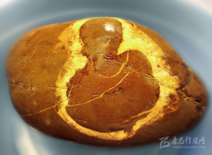 作為一個無組織的業(yè)余獨行淘石者,經(jīng)過數(shù)年的摸、淘、琢磨,我悟出:發(fā)掘趣石最重要的是要獨具慧眼慧心,會讀石紋。是否讀懂石紋,決定著一塊石頭是頑石還是奇石的命運。這是一件很難的事,不僅要運用你獨特的審美視角,還得發(fā)揮你豐富的想象。有時,為了讀懂一些石紋,我會抱著這塊石頭如考古學(xué)家般仔細琢磨,從正面、側(cè)面,再到背面,又從左邊旋到右邊,或者上下顛倒來打量……一番冥思苦想,會意會神,直到靈感涌起、慧心頓悟,尤如洞天石扉訇然中開,眼前的頑石拙巖,頃刻便化為藝術(shù)珍寶,令我欣喜若狂。正如悉達多說:“這塊石頭是石頭,它也是動物,也是神,也是佛,我敬重它和熱愛它,并非因為它有朝一日會變成這個或那個,而是因為它早就是這一切,一直是這一切?!背錆M靈性的石頭在你和美妙的自然間搭起了一座通靈的橋梁。淘得趣石,還需緣分。就像人與人的相遇講究緣分,遇到心儀的石頭也講究緣分天助。有年春節(jié),我與父親去河邊轉(zhuǎn)游,面對涪江寬闊的石灘,我的淘石癮又犯了。但出門前答應(yīng)過父親,這次只逛不撿石頭。我知道老爸心疼我一個女子大過年的撿石頭。河邊冷,且石頭扛起來很重,手與衣服都會弄得很臟。我邊陪父親漫走閑聊,眼睛卻止不住往河灘逡巡,仍希望無意中淘到中意的石頭。走著走著,我發(fā)現(xiàn)有一群鳥歡唱著從遠處一個石堆飛起,冥冥中感覺那里有寶貝,遂向老爸懇求,過去看一下就回來。來到那個石堆中心,幾乎不費什么功夫,就看到一塊橢圓形石頭上有著一個自帶金色佛光圈的如來佛半身像。我怔住了,有點不敢相信如此幸運,蹲在那里久久打量。老爸隨后趕過來,看到佛像石,連連贊嘆了好幾句“太神奇了”。然后,他毫不猶豫地就幫我把石頭搬起來就走?;氐郊抑?,如獲至寶的我,趕緊清洗石頭,在清水的滋潤下,佛像的輪廓更加清晰。頸上的佛珠、袈裟線也分明,細看令人叫絕的這竟是一尊三面佛:正面、左側(cè)向、右側(cè)向均是佛。而在此石背面,也清晰出現(xiàn)了一個草書的“吉”字,真令人喜出望外。吉佛石,就這樣神奇地走進了我的生活,讓我相信一切緣分都是可遇不可求的。