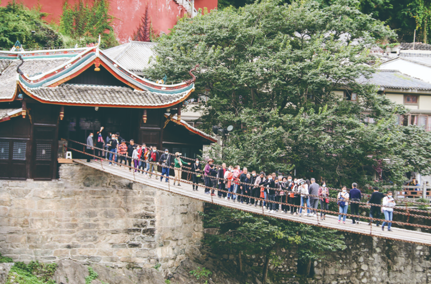 那是一九三五年五月底的一天,一支頭戴紅五星八角帽的隊(duì)伍,如同天兵一樣突然降臨在了橋的西岸。守橋的國(guó)民黨軍隊(duì)大約早就知道這支隊(duì)伍要從這里經(jīng)過(guò),于是將橋上的橋板撤掉,只剩十三根鐵鏈空當(dāng)當(dāng)?shù)亓粼诤由?。正值初夏時(shí)節(jié),河水洶涌。橋東頭的機(jī)槍,時(shí)不時(shí)一陣掃射,要想過(guò)河,堪比登天。爺爺?shù)臓敔敚≡跇蛭?,親眼目睹了這場(chǎng)戰(zhàn)斗。他說(shuō),這些戴八角帽的人,一點(diǎn)也不怕死,一聲令下,就抓住鐵索往前沖,后面的人,就從老百姓那里借來(lái)門板鋪在橋上一起上。那陣仗(陣勢(shì))啊,幾輩人都沒(méi)見(jiàn)過(guò)。迎著槍林彈雨,不要命地前進(jìn)。前面的人犧牲了,后面的人又補(bǔ)上。橋東頭守橋的隊(duì)伍哪里見(jiàn)過(guò)這架式,橋也不守了,一把火點(diǎn)燃橋樓,爬起來(lái)轉(zhuǎn)身就跑得一干二凈。