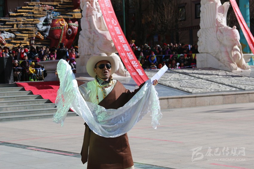 吉祥頌,藏語稱為“協(xié)巴”,是州級非物質(zhì)文化遺產(chǎn)之一?!皡f(xié)巴”在藏族民間生活中占有重要的地位,尤其在喜慶活動上,是一項(xiàng)不可或缺的重要儀式。州級非物質(zhì)文化遺產(chǎn)傳承人——高城鎮(zhèn)車馬村的翁堆老人手捧潔白的哈達(dá),為觀眾表演了《協(xié)巴——中國夢、理塘夢》,展現(xiàn)了時代變遷中,“吉祥頌”這一民間藝術(shù)在思想內(nèi)容和藝術(shù)手法的創(chuàng)新之美。