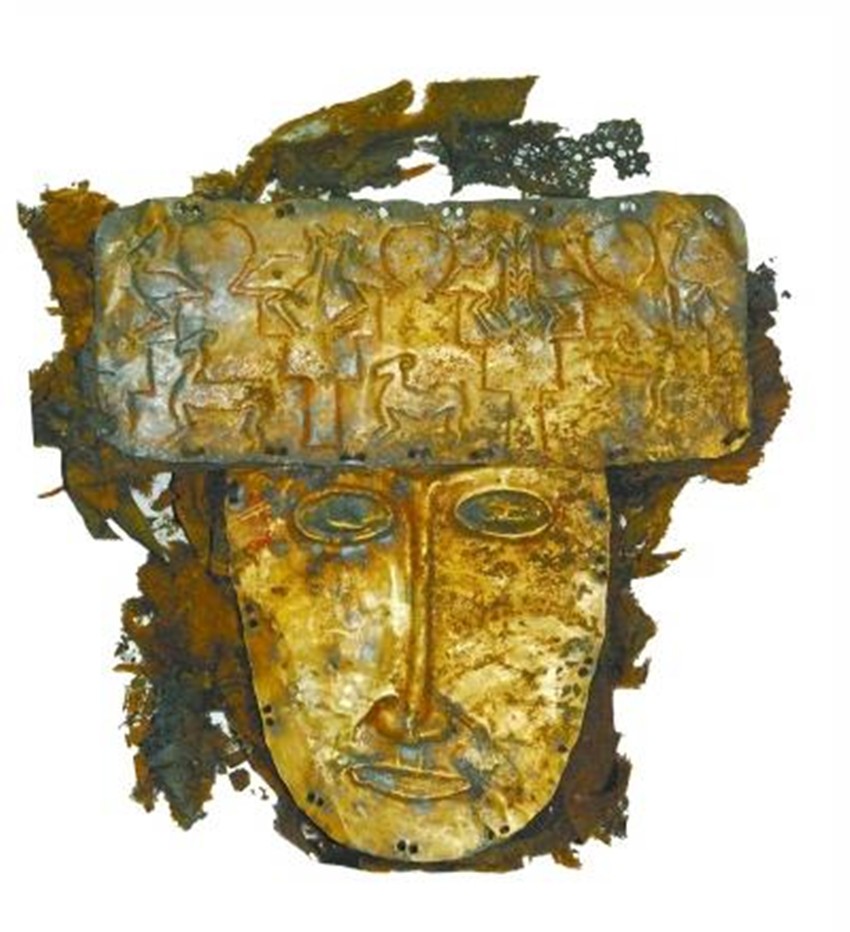 這是西藏天葬的早期形式?或是為了能夠更長久地保存而剔除軟組織,留下堅硬的尸骨?雖然我們對于這一葬俗的深層原因還不得而知,但可以推測,黃金面具最基本的功能可能是用以在尸骨最終埋入墓室時進行面部裝飾。用朱紅色的顏料涂在面具的五官輪廓上,可以創(chuàng)造出活生生的人的形象,用金燦燦的貴重金屬襯上金燦燦的絲綢覆面,打造出王者風(fēng)范,既可以維護死者最后的尊嚴,也體現(xiàn)了他所擁有的財富和社會地位。