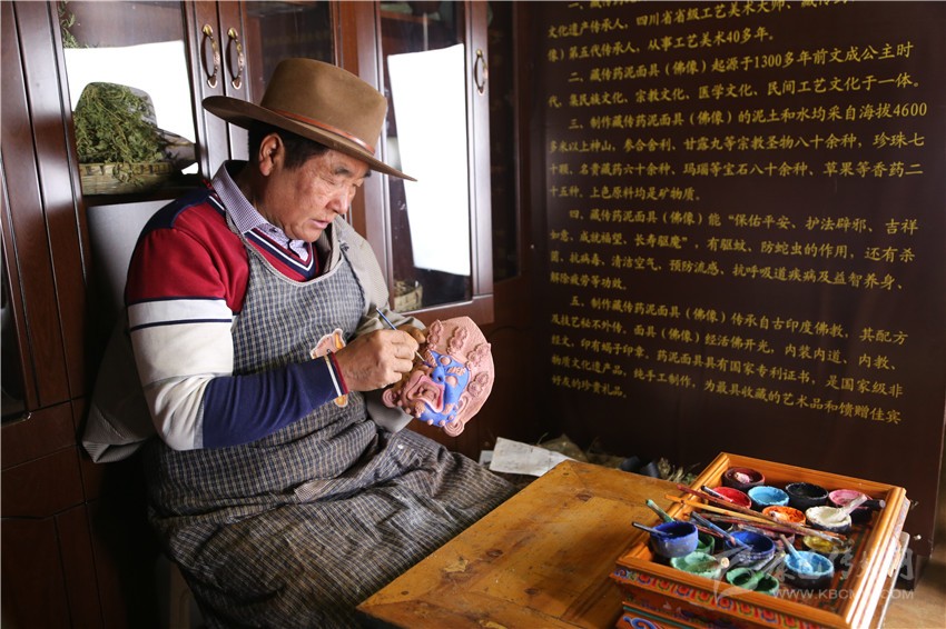 待面具自然風(fēng)干后,用礦物質(zhì)、植物的根等制作的自然顏料進(jìn)行著色,自然顏料有不變色、耐光的特性,通過(guò)一淡、二濃、三淡的上色過(guò)程使面具涂色均勻,待顏料曬干后對(duì)面具進(jìn)行磨光,去除雜物,再對(duì)面具進(jìn)行裝藏念經(jīng),如此,一個(gè)藥泥面具制作完成。做好的藥泥面具有濃郁的藥材香氣,并有著驅(qū)蚊、殺菌、抗病毒、清潔空氣、解除疲勞等功效。