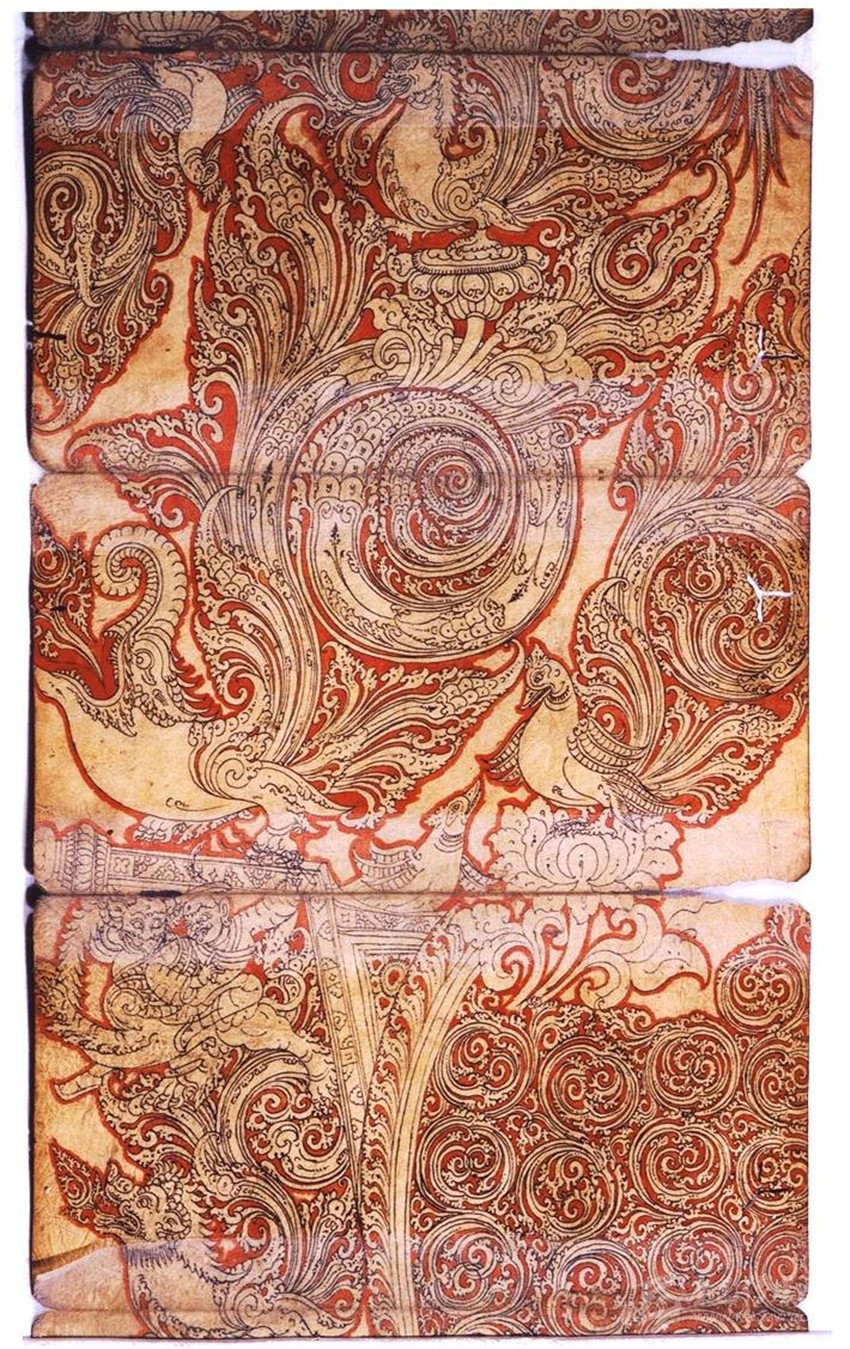 (二)裝飾圖案化:藝術(shù)中的“希臘化”過程,蔓延到南亞地區(qū),已是“強弩之末”。故南亞美術(shù)受到希臘藝術(shù)的影響,但是并不徹底。所以在表現(xiàn)物象體積和空間的時候,顯得力不從心,往往是想寫實的物象表現(xiàn)成裝飾性的圖案,時間一長,便演變成為南亞的審美傳統(tǒng)。比如各種動物和植物紋樣,以及卷草紋、連珠紋等。尼瓦爾唐卡中的人物、動物、植物和事物大多通過精美的、圓弧組成的各種裝飾圖案來表現(xiàn)。