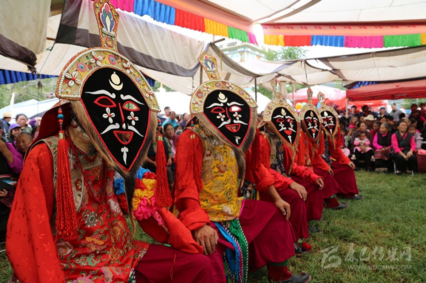 “亞堆”的第二天,藏戲正式開演。首先出場(chǎng)的是《江嘎冉》和《扎西協(xié)哇》,這是藏戲中居首位的兩個(gè)最古老的戲,流淌著祝福吉祥、祈禱幸福的主弦律。在大號(hào)、鎖吶、胡琴、笛子、鼓、鈸的敲擊聲中,演員們戴著面具邊跳邊唱: