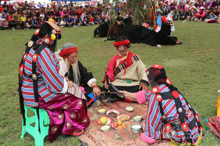 不過(guò)依照習(xí)慣,大家還是要募捐。誰(shuí)家募捐了多少,藏戲團(tuán)會(huì)在“央勒節(jié)”的最后一天,即藏戲演出的尾聲“扎西交”上道謝。“扎西交”有幾層意義,祝賀本次“央勒節(jié)”功德圓滿,祈愿來(lái)年五谷豐登幸福安康,感謝上天賜予大地的恩惠。演員們向供奉在大帳篷中央的祖師爺唐東杰布莊重磕頭,把撒糌灑向天空,謝幕,“央勒節(jié)”便在熱烈的氣氛中結(jié)束了。每當(dāng)聽到話筒里喊出:“XX顧伙(顧伙:巴塘方言藏語(yǔ),即搭帳篷的某一家),捐款XX元,道謝了!”時(shí),大家都會(huì)生出不舍與惆悵之感,撤帳篷回家,日子又恢復(fù)到平常的瑣碎里了。