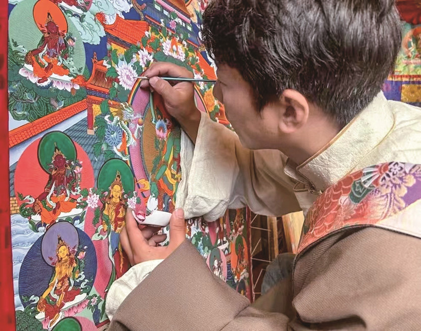 “唐卡作為中國民族繪畫藝術的珍品,不僅呈現(xiàn)精湛的技藝和美學,更是傳遞一種文化?!睏畹潜硎?,他作為一名縣級非遺傳承人,要在繼承傳統(tǒng)技藝的基礎上,采用多元藝術技藝賦予傳統(tǒng)唐卡更多創(chuàng)意,讓民族文化瑰寶能夠更好地發(fā)揚光大。