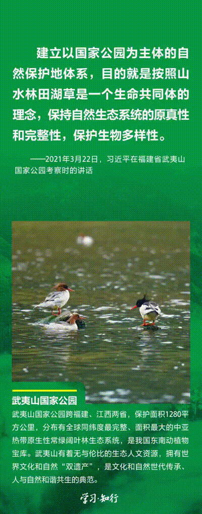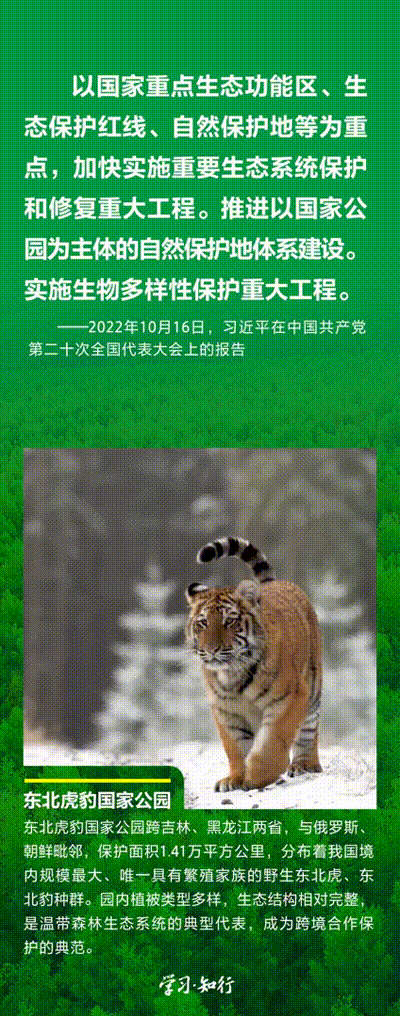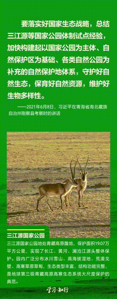 “生物多樣性使地球充滿生機(jī),也是人類生存和發(fā)展的基礎(chǔ)?!蓖七M(jìn)以國(guó)家公園為主體的自然保護(hù)地體系建設(shè),是習(xí)近平總書記作出的重要部署。三江源、大熊貓、東北虎豹、海南熱帶雨林、武夷山等首批國(guó)家公園正式設(shè)立以來,生態(tài)功能持續(xù)向好,對(duì)保護(hù)生物多樣性、推進(jìn)人與自然和諧共生的現(xiàn)代化具有重要意義。