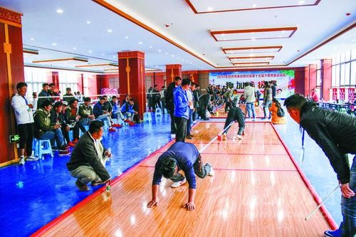 今年,我州將由115名運(yùn)動(dòng)員、教練員等組成11支運(yùn)動(dòng)隊(duì),參與賽事設(shè)置的8個(gè)競(jìng)賽項(xiàng)目和2個(gè)表演項(xiàng)目,其中有兩支隊(duì)伍將參與綜合類表演項(xiàng)目比賽。我州總參賽人數(shù)相比上一屆略有減少。我州參加綜合類表演項(xiàng)目比賽的節(jié)目是《瑪亞切通》和《炯動(dòng)》?!冬攣喦型ā纷g為孔雀吃水,主要體現(xiàn)力量和平衡的動(dòng)作;《炯動(dòng)》取材于藏民族農(nóng)村修建房屋時(shí)的勞動(dòng)場(chǎng)面,以青年男女在勞動(dòng)過程中載歌載舞對(duì)歌或比拼勞動(dòng)成果、質(zhì)量、進(jìn)度為內(nèi)容,主要比拼身體的力量和靈活度。我州參加競(jìng)技類表演項(xiàng)目比賽的節(jié)目是《嘎久》?!陡戮谩芬鉃榉嗰R鞍或吉祥翻越,是藏族人民節(jié)日聚會(huì)時(shí)的一種競(jìng)技體育活動(dòng),主要比拼靈活性、趣味性和技巧性。