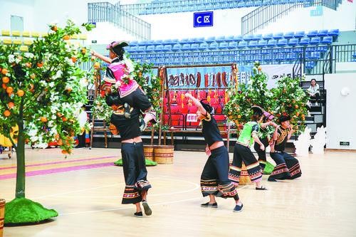 雅安市代表團(tuán)教練李鏡文告訴記者,《石炯諧博》表演項(xiàng)目依托當(dāng)?shù)匾图颐袼?,在黃果柑豐收的季節(jié),石棉縣彝族小伙、姑娘們?cè)诠掷锊烧S果柑時(shí)所產(chǎn)生的勞動(dòng)趣味競(jìng)技活動(dòng)的演繹,反映了少數(shù)民族地區(qū)經(jīng)濟(jì)發(fā)展、社會(huì)繁榮穩(wěn)定、各族人民安居樂業(yè)的生活和精神風(fēng)貌。