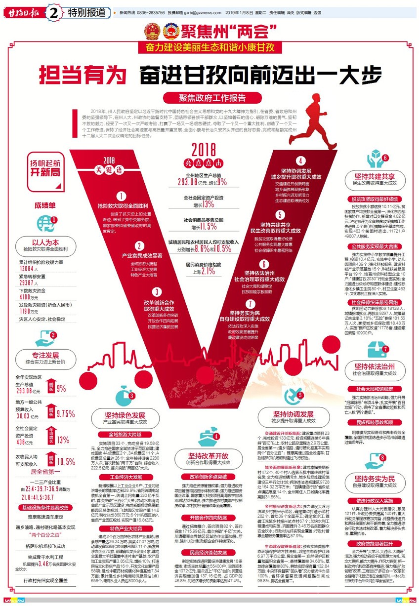 肖友才在報(bào)告中說(shuō),2018年,州人民政府堅(jiān)定以習(xí)近平新時(shí)代中國(guó)特色社會(huì)主義思想和黨的十九大精神為指引,在省委、省政府和州委的堅(jiān)強(qiáng)領(lǐng)導(dǎo)下,在州人大、州政協(xié)的監(jiān)督支持下,團(tuán)結(jié)帶領(lǐng)各族干部群眾,以堅(jiān)如磐石的信心、破除萬(wàn)難的勇氣、堅(jiān)韌不拔的毅力,經(jīng)受了一次又一次嚴(yán)峻考驗(yàn),打贏了一場(chǎng)又一場(chǎng)艱苦硬仗,奪取了一個(gè)又一個(gè)重大勝利,創(chuàng)造了一個(gè)又一個(gè)工作奇跡,保持了經(jīng)濟(jì)社會(huì)高速度與高質(zhì)量并重發(fā)展、全面小康與長(zhǎng)治久安齊頭并進(jìn)的良好態(tài)勢(shì),完成和超額完成州十二屆人大二次會(huì)議確定的目標(biāo)任務(wù)。預(yù)計(jì)全年實(shí)現(xiàn)地區(qū)生產(chǎn)總值293.08億元,增長(zhǎng)(同比,下同)9%,超目標(biāo)任務(wù)1.5個(gè)百分點(diǎn);全社會(huì)固定資產(chǎn)投資438億元,同口徑增長(zhǎng)13%,超目標(biāo)任務(wù)5個(gè)百分點(diǎn);工業(yè)增加值71.77億元,增長(zhǎng)11%,超目標(biāo)任務(wù)2個(gè)百分點(diǎn)(其中,規(guī)模以上工業(yè)增加值61.57億元,增長(zhǎng)12.5%,超目標(biāo)任務(wù)2.5個(gè)百分點(diǎn));社會(huì)消費(fèi)品零售總額101.3億元,增長(zhǎng)11.5%,完成目標(biāo)任務(wù);地方一般公共預(yù)算收入30.03億元,增長(zhǎng)9.75%,超目標(biāo)任務(wù)1.75個(gè)百分點(diǎn);城鎮(zhèn)居民人均可支配收入32022元,增長(zhǎng)8.6%,超目標(biāo)任務(wù)0.1個(gè)百分點(diǎn);農(nóng)村居民人均可支配收入11540元,增長(zhǎng)10.5%,超目標(biāo)任務(wù)0.5個(gè)百分點(diǎn);居民消費(fèi)價(jià)格指數(shù)上漲2.1%,低于省控制線(xiàn)0.9個(gè)百分點(diǎn)。一二三產(chǎn)業(yè)比重由23.4∶39.7∶36.9調(diào)整為21.8∶41.5∶36.7。
