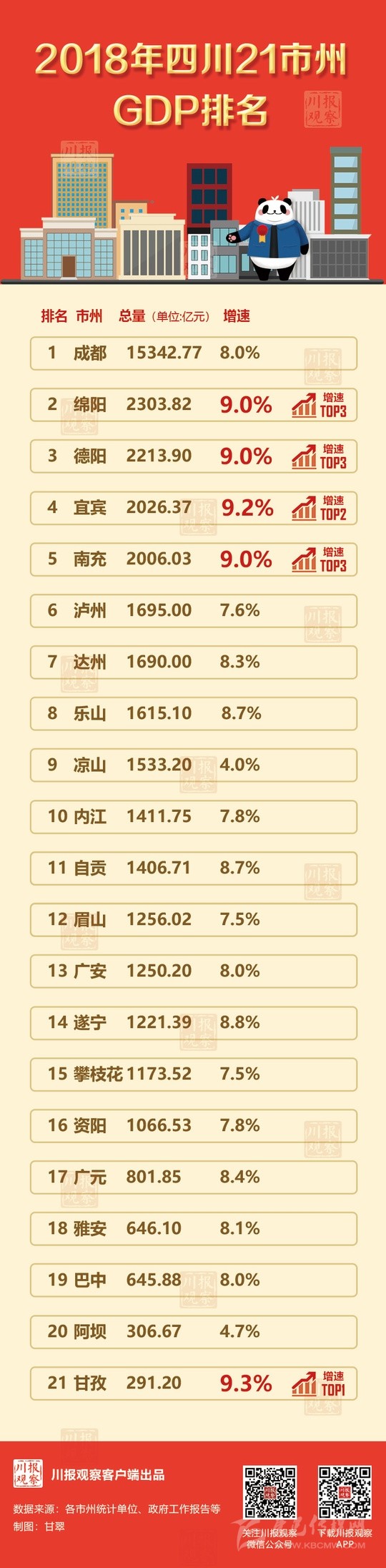 21個市州中,“主干”成都繼續(xù)“獨領(lǐng)風(fēng)騷”,以15342.77億元的成績牢牢占據(jù)“第一把交椅”。熟悉四川的朋友,對于成都的表現(xiàn)或許已經(jīng)習(xí)以為常。