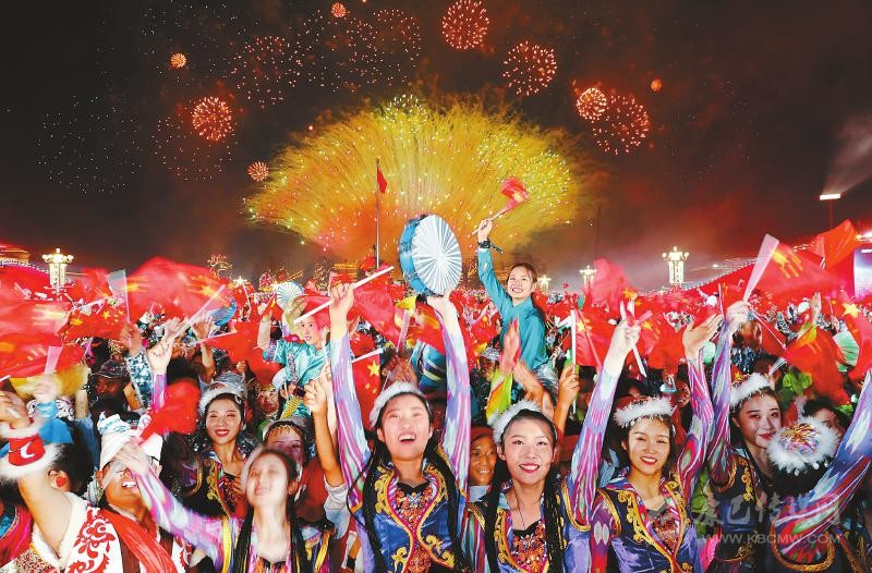 “祖國(guó)萬(wàn)歲!”當(dāng)“光影屏”組成這四個(gè)閃亮的大字,全場(chǎng)沸騰,各族各界聯(lián)歡群眾整齊劃一的喊聲響徹天際。