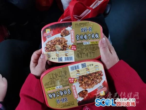 18日中午12時, 列車出發(fā)2小時后,巴中恩陽人鄔兵領到了來自家鄉(xiāng)的午餐——一盒自熱米飯,配菜是宮保雞丁?!安诲e不錯,今年不用吃方便面了?!倍松厦罪埖泥w兵笑了笑。