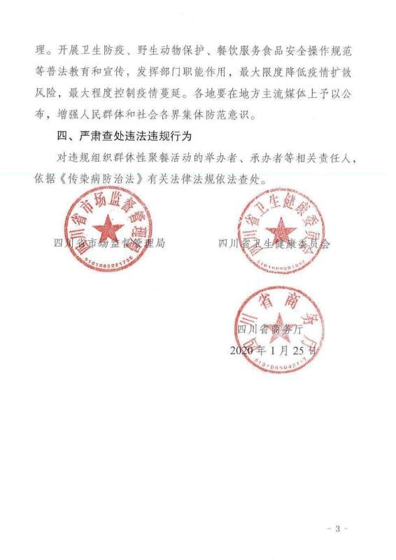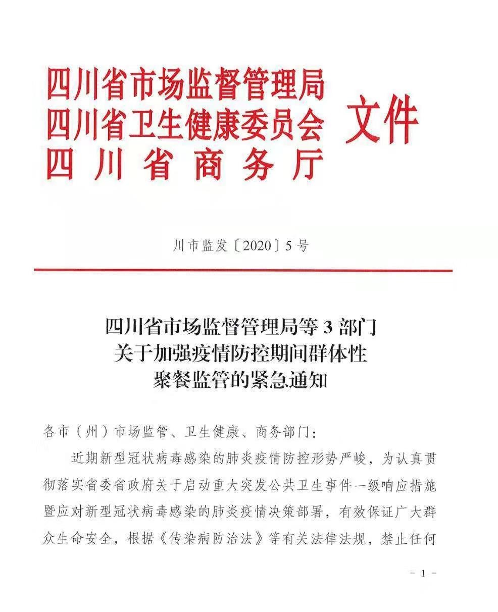 四川新聞網(wǎng)成都1月25日訊(記者 李丹)1月25日,四川省市場監(jiān)督管理局、四川省衛(wèi)生健康委員會、四川省商務(wù)廳3部門聯(lián)合發(fā)布緊急通知,近期新型冠狀病毒感染的肺炎疫情防控形勢嚴(yán)峻,為認(rèn)真貫徹落實(shí)省委省政府關(guān)于啟動重大突發(fā)公共衛(wèi)生事件一級響應(yīng)措施暨應(yīng)對新型冠狀病毒感染的肺炎疫情決策部署,有效保證廣大群眾生命安全,根據(jù)《傳染病防治法》等有關(guān)法律法規(guī),禁止任何餐飲單位和個人舉辦任何形式的群體性聚餐活動,已經(jīng)訂餐的應(yīng)盡快取消或延期舉辦。