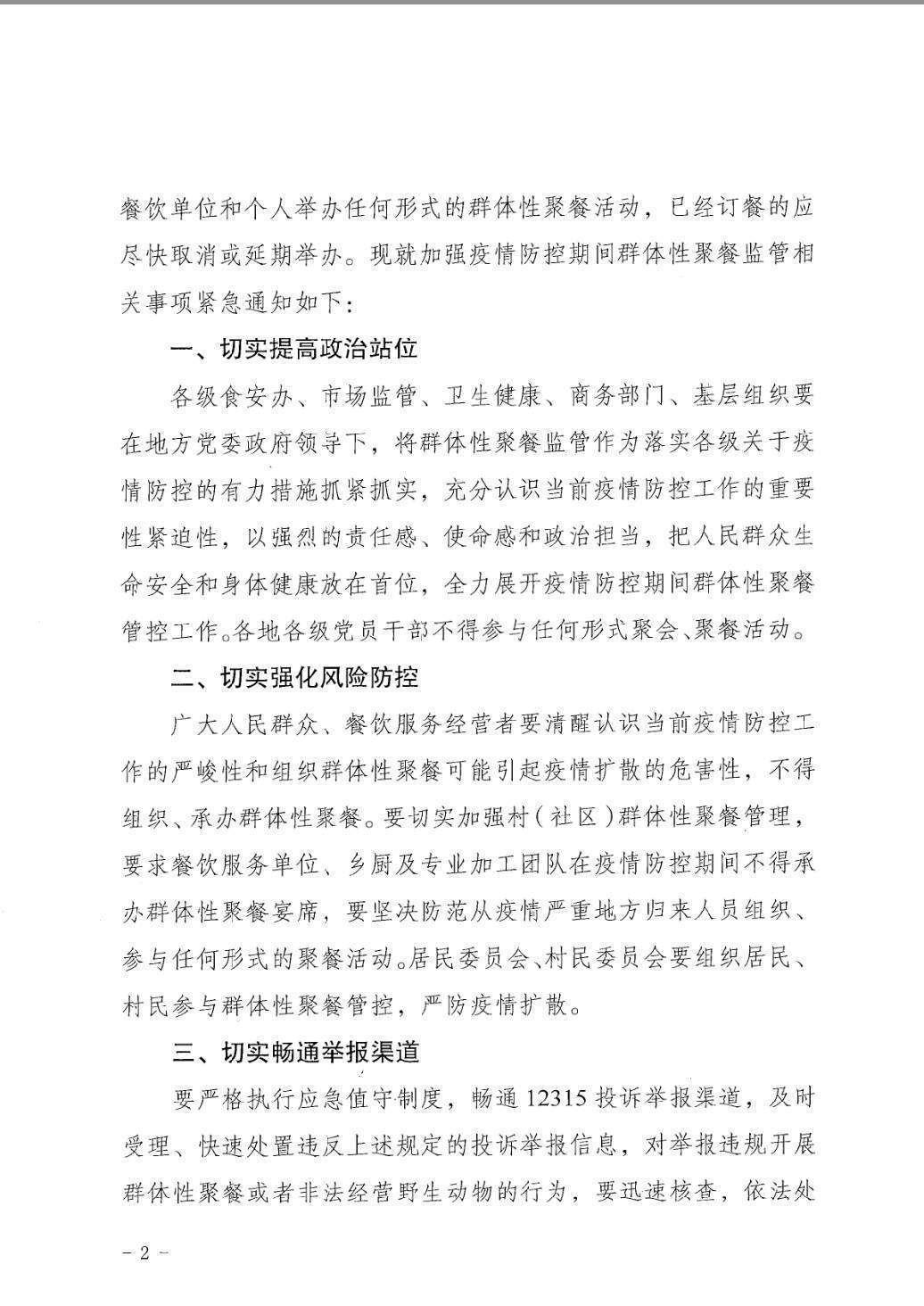 各級食安辦、市場監(jiān)管、衛(wèi)生健康、商務(wù)部門、基層組織要在地方黨委政府領(lǐng)導(dǎo)下,將群體性聚餐監(jiān)管作為落實(shí)各級關(guān)于疫情防控的有力措施抓緊抓實(shí),充分認(rèn)識當(dāng)前疫情防控工作的重要性緊迫性,以強(qiáng)烈的責(zé)任感、使命感和政治擔(dān)當(dāng),把人民群眾生命安全和身體健康放在首位,全力展開疫情防控期間群體性聚餐管控工作。各地各級黨員干部不得參與任何形式聚會、聚餐活動。