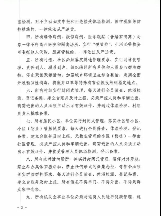 一、州域內(nèi)所有人員必須以高度的責(zé)任感自覺遵守國家和省、州出臺的疫情防控規(guī)定。二、所有人員一律不串門、不集聚,盡量不外出,確需外出的必須佩戴口罩、接受體溫檢測。出現(xiàn)發(fā)熱、咳嗽、乏力等可疑癥狀的,必須佩戴口罩立即就地就近就診并向所在村組(社區(qū))、單位報告。倡導(dǎo)每戶家庭(居家隔離家庭除外)每兩天指派1名家庭成員外出采購生活必需物資。三、所有進(jìn)州、返州人員,必須在一小時內(nèi)主動向居(暫)住地村組(社區(qū))或所在單位如實(shí)報告近14天旅居史,并接受體溫檢測。對不主動如實(shí)申報和拒絕接受體溫檢測、醫(yī)學(xué)觀察等防控措施的,一律依法從嚴(yán)追責(zé)。四、所有確診病例、疑似病例、醫(yī)學(xué)觀察(含居家隔離)對象一律不得離開醫(yī)院和隔離場所,實(shí)行“硬管控”,生活必需物資可委托他人代購。脫離管控的,一律依法從嚴(yán)追責(zé)。五、所有村組、社區(qū)必須落實(shí)屬地管理要求,實(shí)行網(wǎng)格化管理,責(zé)任到人、聯(lián)系到戶,組織轄區(qū)所有單位和人員參與群防群控,停止聚集聚餐活動,加強(qiáng)城鄉(xiāng)環(huán)境衛(wèi)生綜合整治,定期全面開展預(yù)防性消毒,將廢棄口罩等特殊有害垃圾投放到指定地點(diǎn)。六、所有村組實(shí)行封閉式管理,每天進(jìn)行全員篩查、體溫檢測、登記備案、建立臺賬并及時上報。必須嚴(yán)控人員和車輛進(jìn)出,確需進(jìn)出的人員必須主動出示有效證件,并通過體溫檢測、村組負(fù)責(zé)人批準(zhǔn)備案。七、所有居民小區(qū)、單位實(shí)行封閉式管理,落實(shí)社區(qū)管小區(qū)、小區(qū)(物業(yè))管居民要求,每天進(jìn)行全員篩查、體溫檢測、登記備案、建立臺賬并及時上報。無物業(yè)管理的小區(qū)(樓棟)一律由社區(qū)管理。必須嚴(yán)控人員和車輛進(jìn)出,確需進(jìn)出的人員必須主動出示有效證件,并接受管理人員體溫檢測、登記備案。八、所有宗教活動場所一律實(shí)行封閉式管理、暫停對外開放,禁止舉辦集體宗教活動,禁止任何形式的聚集念經(jīng)。寺管會必須落實(shí)群防群控要求,每天進(jìn)行全員篩查、體溫檢測、登記備案、建立臺賬并及時上報。所有僧尼不得串門、不得外出,不得到群眾家中念經(jīng)。九、所有機(jī)關(guān)企事業(yè)單位必須對返崗人員進(jìn)行健康管理,建立管理臺賬,并向所在社區(qū)(村組)報備,對確認(rèn)無可疑癥狀的準(zhǔn)予返崗工作。單位食堂必須規(guī)范管理,實(shí)行分散就餐。十、非居民生活必需的公共場所一律關(guān)閉,經(jīng)批準(zhǔn)營業(yè)的公共場所中央空調(diào)一律關(guān)停。商場、超市、賓館、飯店、農(nóng)貿(mào)市場、公共客運(yùn)、個體商戶等市場經(jīng)營主體必須嚴(yán)格落實(shí)疫情防控措施,每天開展預(yù)防性消毒工作,從業(yè)和進(jìn)入人員一律佩戴口罩、檢測體溫、備案登記。藥店、診所、村衛(wèi)生室出售退燒、咳嗽類藥品必須實(shí)名制登記,并每日上報轄區(qū)疾控部門,對近14天有重點(diǎn)疫區(qū)旅居史的立即上報??爝f、外賣實(shí)行無接觸配送。十一、車站、機(jī)場和交通檢疫站點(diǎn)實(shí)行進(jìn)出人員全覆蓋體溫檢測和登記備案制度,對體溫異常人員立即采取就地就近隔離觀察。對拒絕配合的,公安機(jī)關(guān)依法協(xié)助強(qiáng)制執(zhí)行;對妨害執(zhí)行公務(wù)的,公安機(jī)關(guān)依法從嚴(yán)從重處理。十二、廣大黨員、干部、各級人大代表、政協(xié)委員要發(fā)揮帶頭作用,嚴(yán)格管好家人和親屬,積極主動參與疫情防控工作,帶動街坊鄰居自覺遵守相關(guān)規(guī)定。 本公告自發(fā)布之日起實(shí)施,終止日期另行公告。 甘孜州應(yīng)對新型冠狀病毒感染肺炎疫情應(yīng)急指揮部