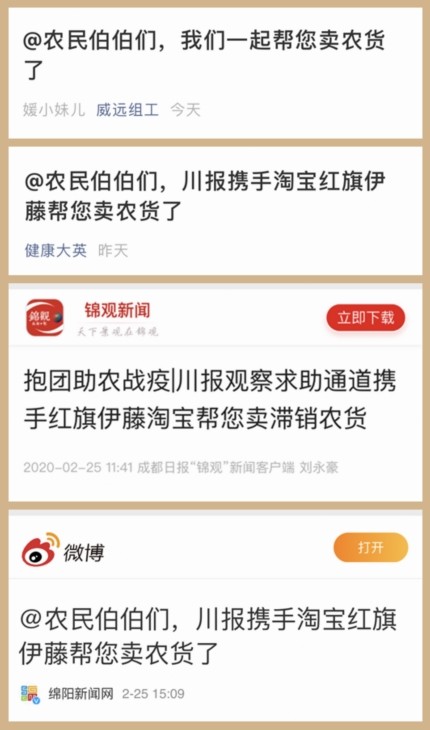 多地市州媒體及縣級(jí)融媒體中心的關(guān)注積極響應(yīng)參與活動(dòng)。“網(wǎng)信四川”公眾號(hào)、南充日?qǐng)?bào)“南充見(jiàn)”、成都日?qǐng)?bào)錦觀、眉山在線、開(kāi)江發(fā)布、直播鹽亭、綿陽(yáng)新聞網(wǎng)、宜賓日?qǐng)?bào)、威遠(yuǎn)組工、健康大英等均及時(shí)對(duì)活動(dòng)相關(guān)信息進(jìn)行了發(fā)布,及時(shí)把抱團(tuán)助農(nóng)戰(zhàn)疫活動(dòng)信息帶給當(dāng)?shù)赜行枨蟮霓r(nóng)戶。