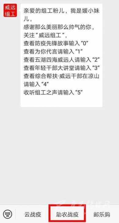 除了媒體之外,一些機(jī)關(guān)單位的政務(wù)新媒體也為活動(dòng)“站臺(tái)”,“威遠(yuǎn)組工”官方微信公眾號(hào)的底部菜單欄,特別新增了“助農(nóng)戰(zhàn)疫”專欄,直接連通川報(bào)觀察頁(yè)面,為當(dāng)?shù)剞r(nóng)戶及農(nóng)業(yè)經(jīng)營(yíng)戶提供解決難題的路徑。