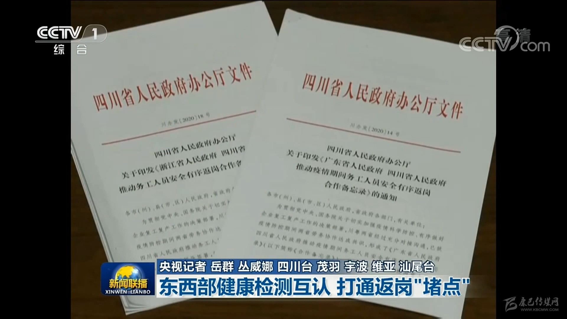 為了讓外出務(wù)工人員順利走出家門返崗,四川務(wù)實推出“健康碼”,又主動和7省市簽署《合作備忘錄》,成為第一個和其他省建立起健康檢測互認工作機制的省份。今天的《新聞聯(lián)播》單條關(guān)注了這一全國創(chuàng)新之舉,央視聯(lián)手四川廣播電視臺探尋機制背后的邏輯。來看川臺記者的一線調(diào)研采訪。