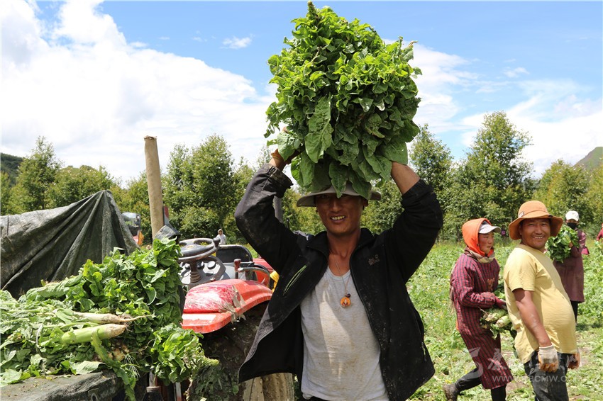 去年5月,記者站在海拔3600米的蘿卜種植基地,天空正飄著細(xì)雨,舉目是云霧繚繞的雪山,雨水滴落在四千多畝青綠色的蘿卜地上,白蘿卜已從土里探出頭來(lái),似乎在等待采收。一股清甜的蘿卜味,伴隨著雨地里收割者的嬉笑聲,撲面而來(lái)。