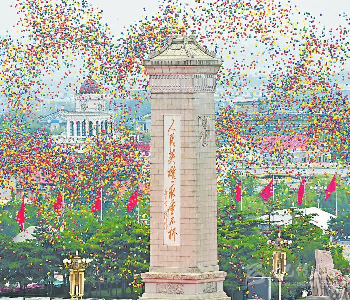 天安門城樓燈火璀璨,廣場上慶祝大會的準備工作緊鑼密鼓。三軍儀仗隊、解放軍聯(lián)合軍樂團,還有北京各高校學生組成的合唱團,正在進行最后的排練。