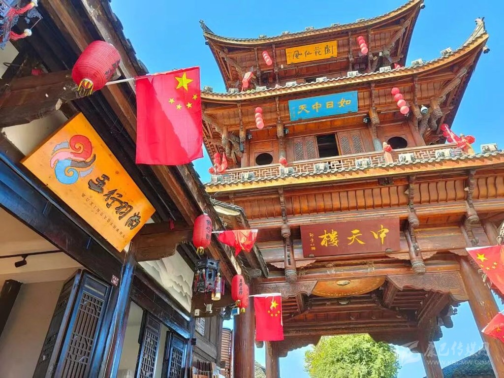 在南充古城閬中,以中天樓為核心鋪開的四條街道,全部被五星紅旗裝點(diǎn)開來(lái),甚至部分街段上空鋪上了“紅旗?!?。新城的主干道,也掛上了一面面五星紅旗,站在街頭放眼望去,鮮艷的五星紅旗成為一道最靚麗的風(fēng)景線。