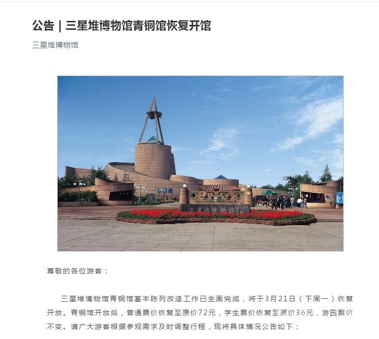 三星堆博物館青銅館基本陳列改造工作已全面完成,將于3月21日(下周一)恢復開放。青銅館開放后,普通票價恢復至原價72元,學生票價恢復至原價36元,游園票價不變。請廣大游客根據(jù)參觀需求及時調整行程,現(xiàn)將具體情況公告如下: