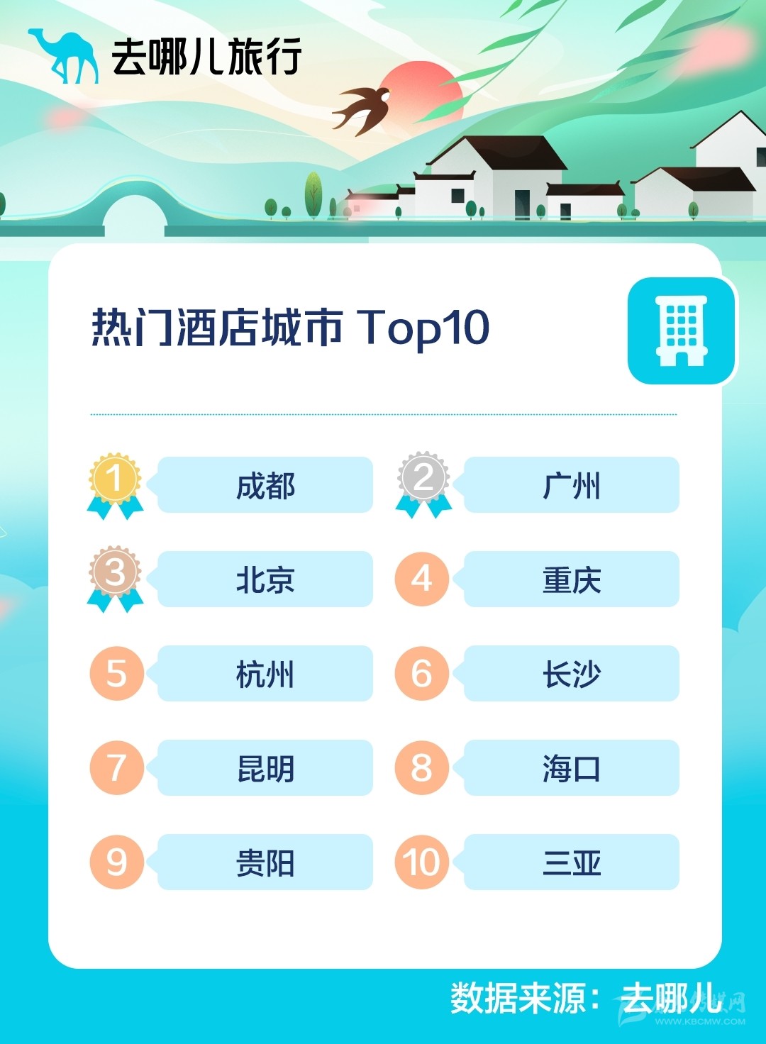 去哪兒旅行預(yù)測(cè):2022清明假期熱門酒店城市TOP10。
