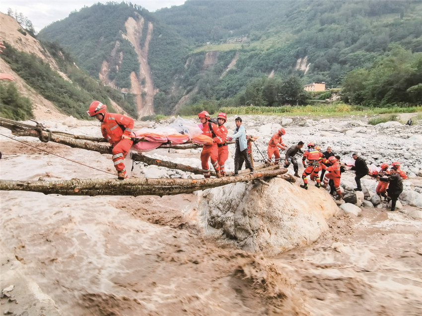 道路中斷、信號中斷,河流上漲、橋梁垮塌?!皼]有橋,我們的雙手就是橋?!标P(guān)鍵時刻,四川省森林消防總隊甘孜支隊消防員兵分兩路實施營救。一路“繩為引、步為尺”先期過河救治傷員,一路就地取材急流上用樹干搭起“生命通道”,自制擔(dān)架將傷員一一運送過河;截至5日晚23時40分,甘孜森林消防隊員們翻山越嶺往返近7小時,安全轉(zhuǎn)運重傷員24人、近200名群眾,徒步行程18公里。