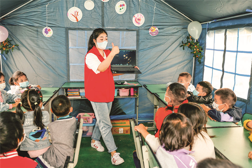 帳篷外,用簡易紙板做成的牌子“青青兒童樂園”特別顯眼,這是首個建在地震震中的兒童樂園。“這頂帳篷中充滿了孩子們的歡聲笑語,這在地震災(zāi)區(qū)就是最動聽的聲音!”青年志愿者毛建美介紹,為了疏導(dǎo)災(zāi)區(qū)孩子們的情緒、減輕家長們的壓力,相關(guān)部門專門在這里設(shè)置了“青青兒童樂園”,“這里配備5名幼師專業(yè)志愿者和3名大學(xué)生志愿者陪護(hù)照看,開展學(xué)習(xí)輔導(dǎo)、健康衛(wèi)生、游戲活動、心靈陪伴、防災(zāi)減災(zāi)等五大領(lǐng)域的活動服務(wù)。”