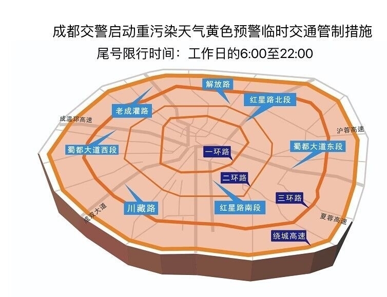 三、工作日的6:00至22:00,在四環(huán)路(成都繞城高速公路G4202,不含)以內(nèi)區(qū)域道路,實行汽車尾號限行,按照機動車號牌(含臨時號牌汽車)的最后一位阿拉伯數(shù)字尾號限行。即:星期一限尾號“1”和“6”,星期二限尾號“2”和“7”;星期三限尾號“3”和“8”;星期四限尾號“4”和“9”;星期五限尾號“5”和“0”。公休日因法定節(jié)假日調(diào)休為工作日的,不限行。