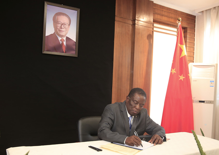 12月5日,津巴布韋總統(tǒng)姆南加古瓦在中國駐津巴布韋大使館吊唁江澤民同志。 肖恩·朱薩 攝(新華社 發(fā))