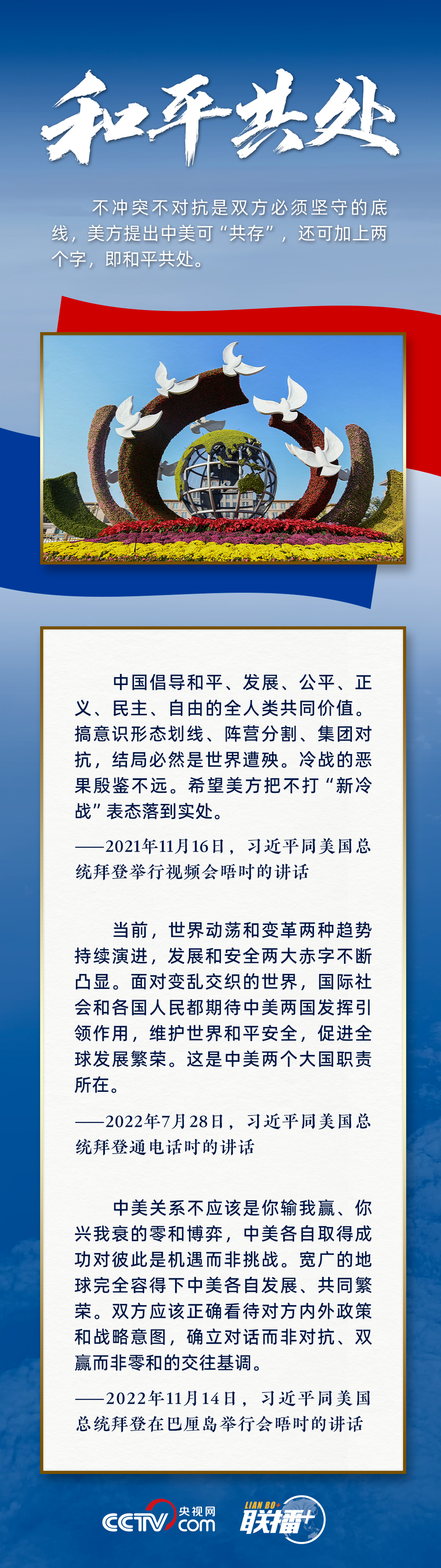 “中美關(guān)系不是一道是否搞好的選擇題,而是一道如何搞好的必答題?!睂τ谌绾握_把握中美關(guān)系,習近平主席提出新時期中美相處應(yīng)該堅持三點原則。央視網(wǎng)《聯(lián)播+》與您一起學習。