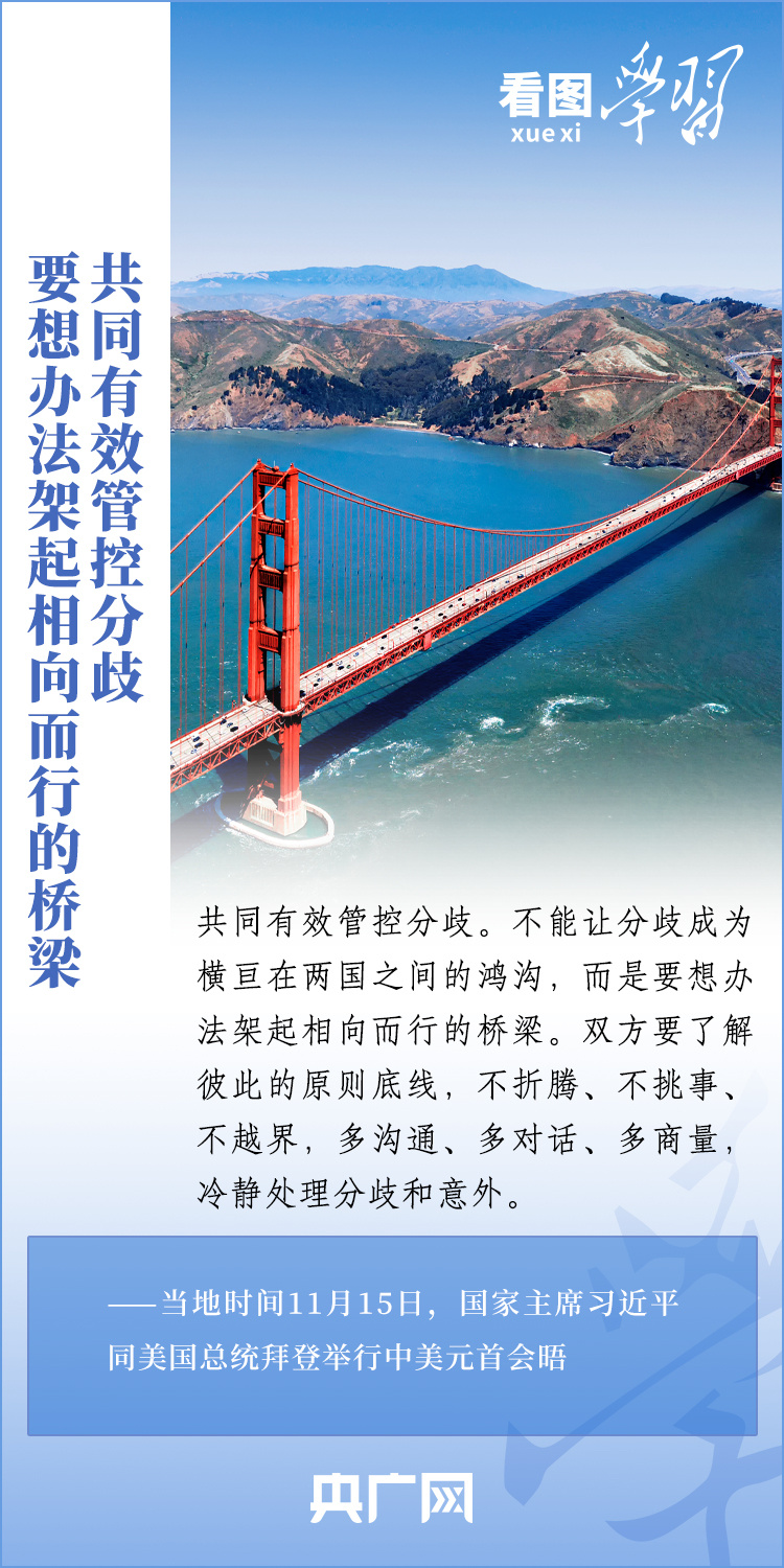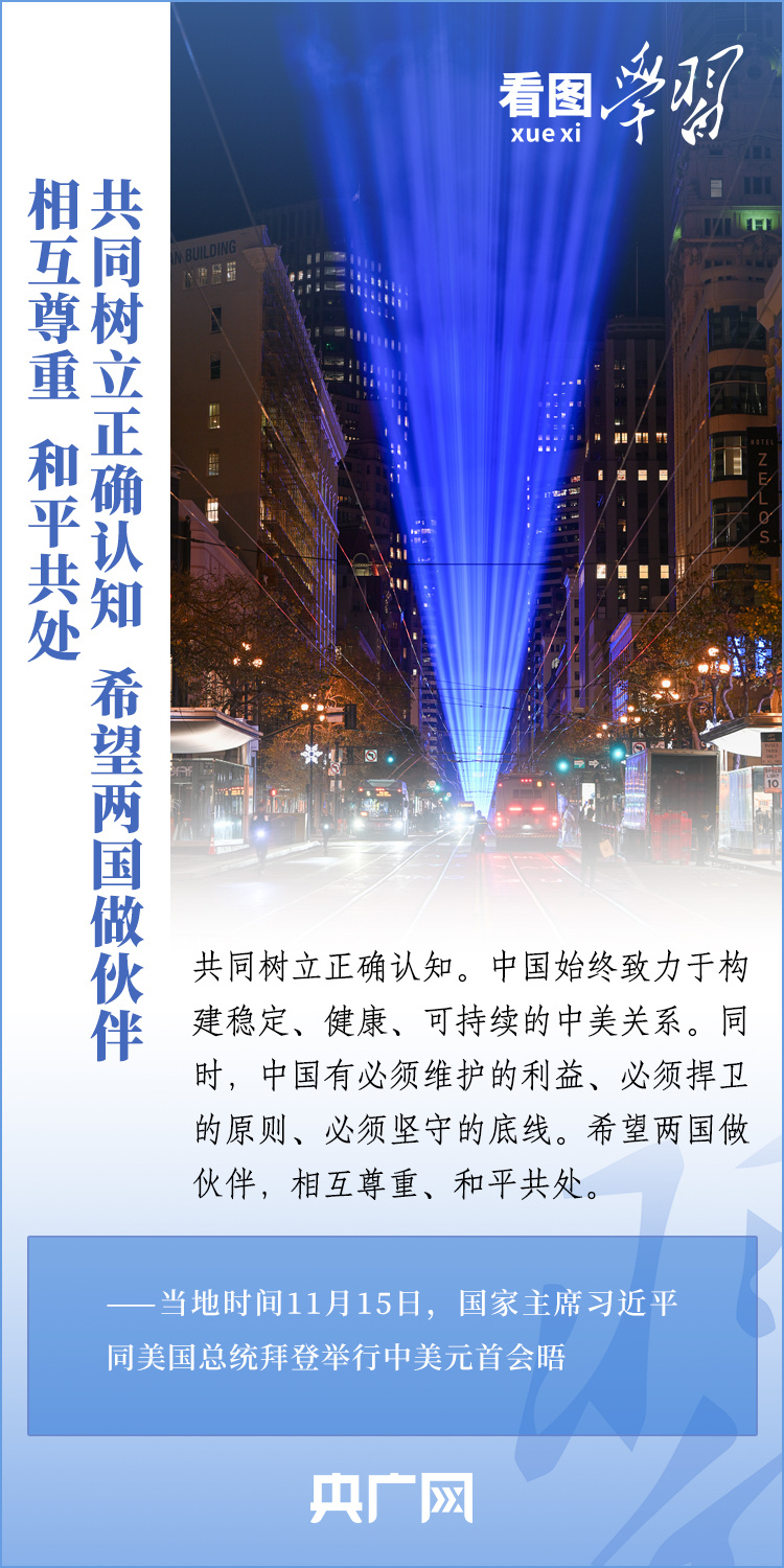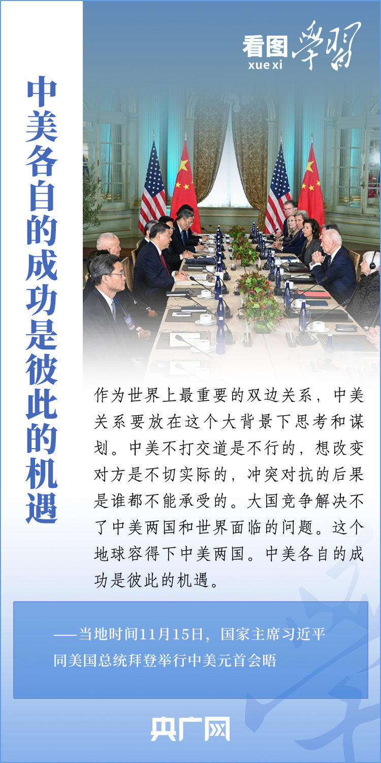 當(dāng)?shù)貢r(shí)間11月15日,國(guó)家主席習(xí)近平在美國(guó)舊金山斐洛里莊園同美國(guó)總統(tǒng)拜登舉行中美元首會(huì)晤。兩國(guó)元首就事關(guān)中美關(guān)系的戰(zhàn)略性、全局性、方向性問(wèn)題以及事關(guān)世界和平和發(fā)展的重大問(wèn)題坦誠(chéng)深入地交換了意見。習(xí)近平主席指出,大國(guó)競(jìng)爭(zhēng)解決不了中美兩國(guó)和世界面臨的問(wèn)題。這個(gè)地球容得下中美兩國(guó)。中美各自的成功是彼此的機(jī)遇。一起來(lái)學(xué)習(xí)!