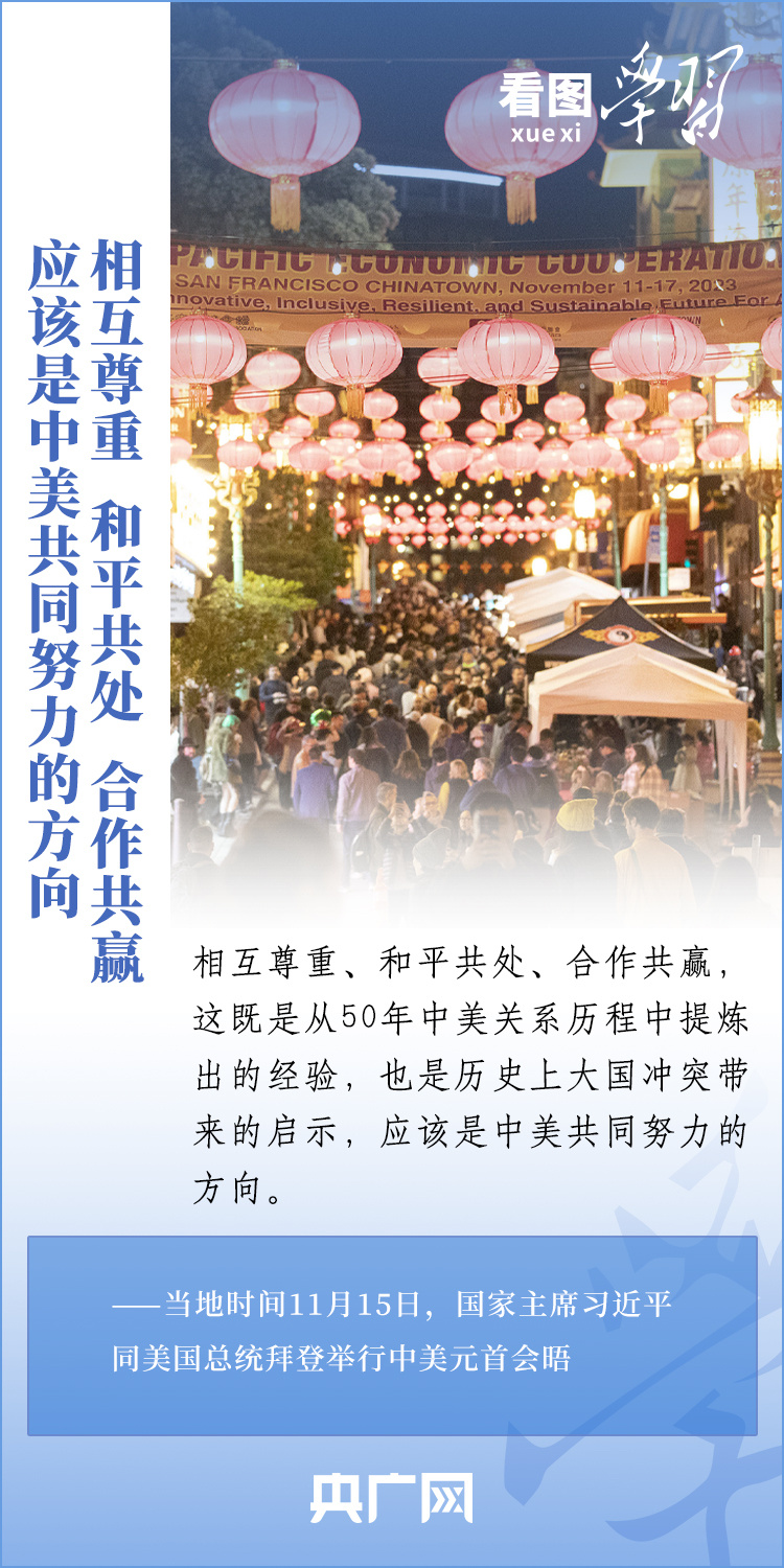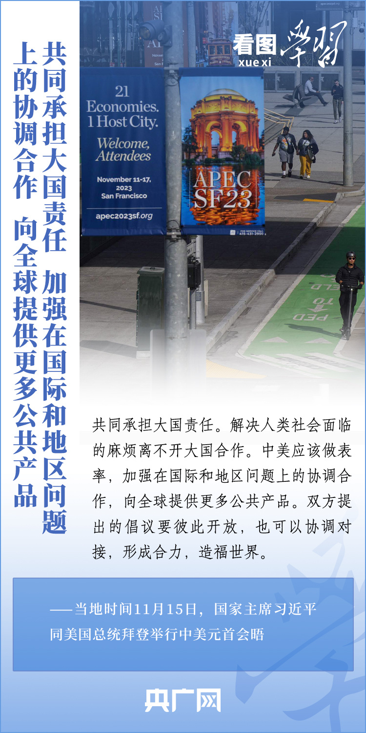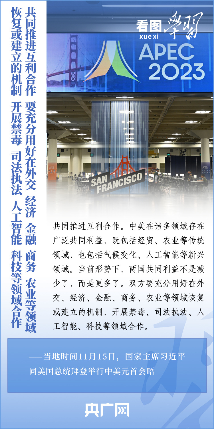 當(dāng)?shù)貢r(shí)間11月15日,國(guó)家主席習(xí)近平在美國(guó)舊金山斐洛里莊園同美國(guó)總統(tǒng)拜登舉行中美元首會(huì)晤。兩國(guó)元首就事關(guān)中美關(guān)系的戰(zhàn)略性、全局性、方向性問(wèn)題以及事關(guān)世界和平和發(fā)展的重大問(wèn)題坦誠(chéng)深入地交換了意見。習(xí)近平主席指出,大國(guó)競(jìng)爭(zhēng)解決不了中美兩國(guó)和世界面臨的問(wèn)題。這個(gè)地球容得下中美兩國(guó)。中美各自的成功是彼此的機(jī)遇。一起來(lái)學(xué)習(xí)!