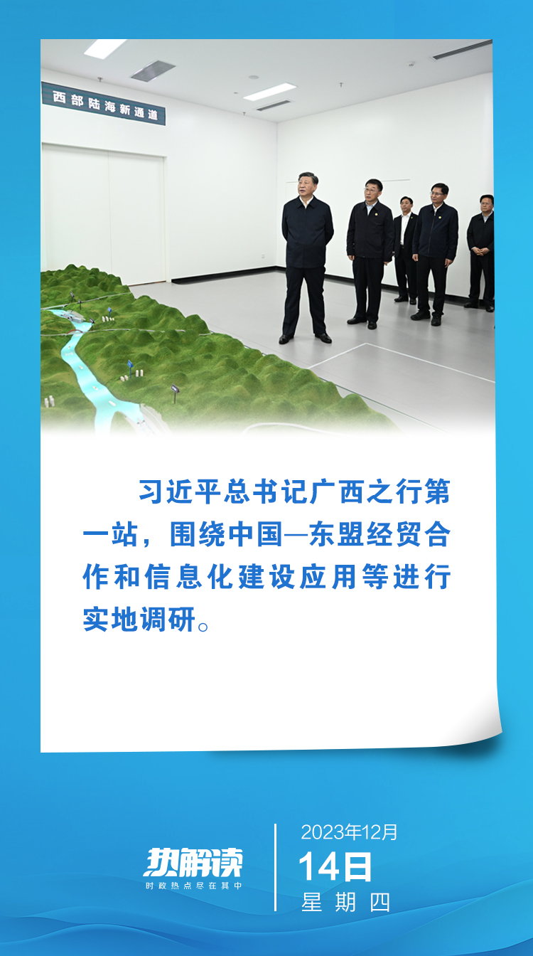 熱解讀12月14日,結(jié)束越南出訪回國(guó)后,習(xí)近平總書記在廣西考察。第一站,他走進(jìn)中國(guó)—東盟信息港股份有限公司,圍繞中國(guó)東盟經(jīng)貿(mào)合作和信息化建設(shè)應(yīng)用等進(jìn)行實(shí)地調(diào)研。