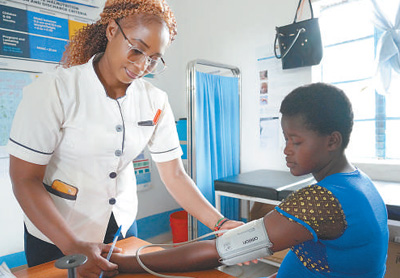 穆薩烏(左)為一名當(dāng)?shù)卦袐D測(cè)量血壓。