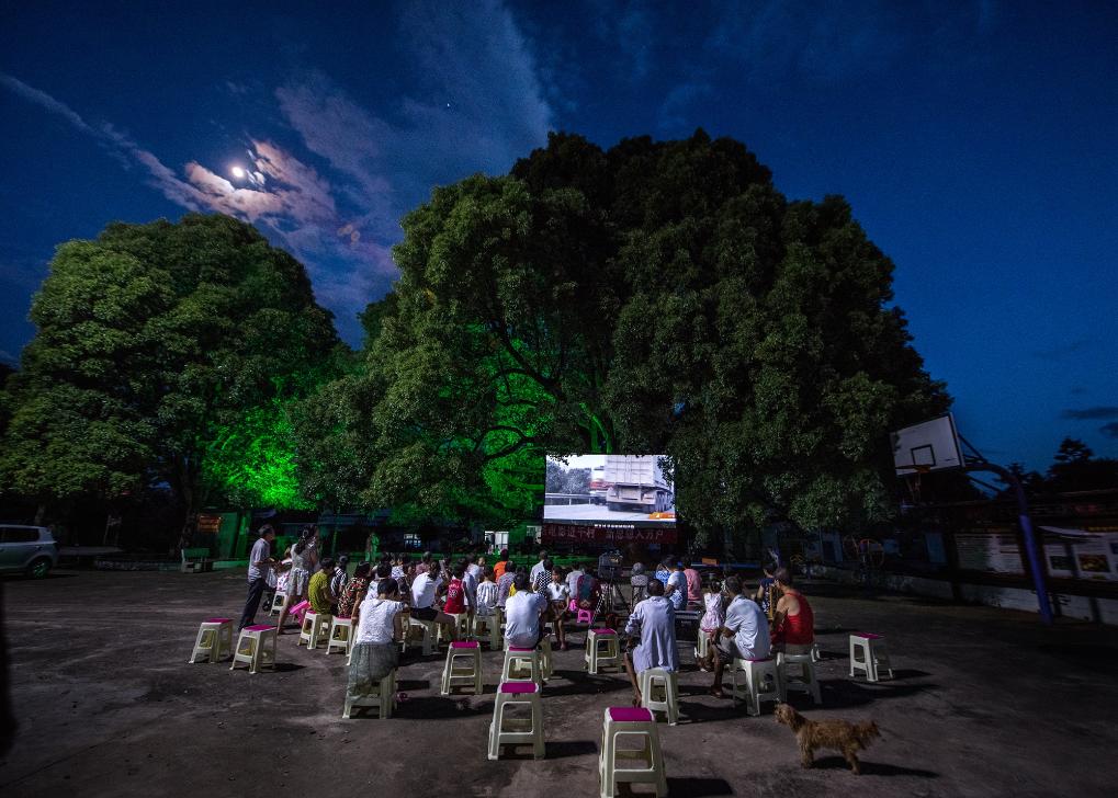 村民在菜花坪鎮(zhèn)菜塘村弄堂文化廣場(chǎng)觀看電影。(譚德樂 攝)
