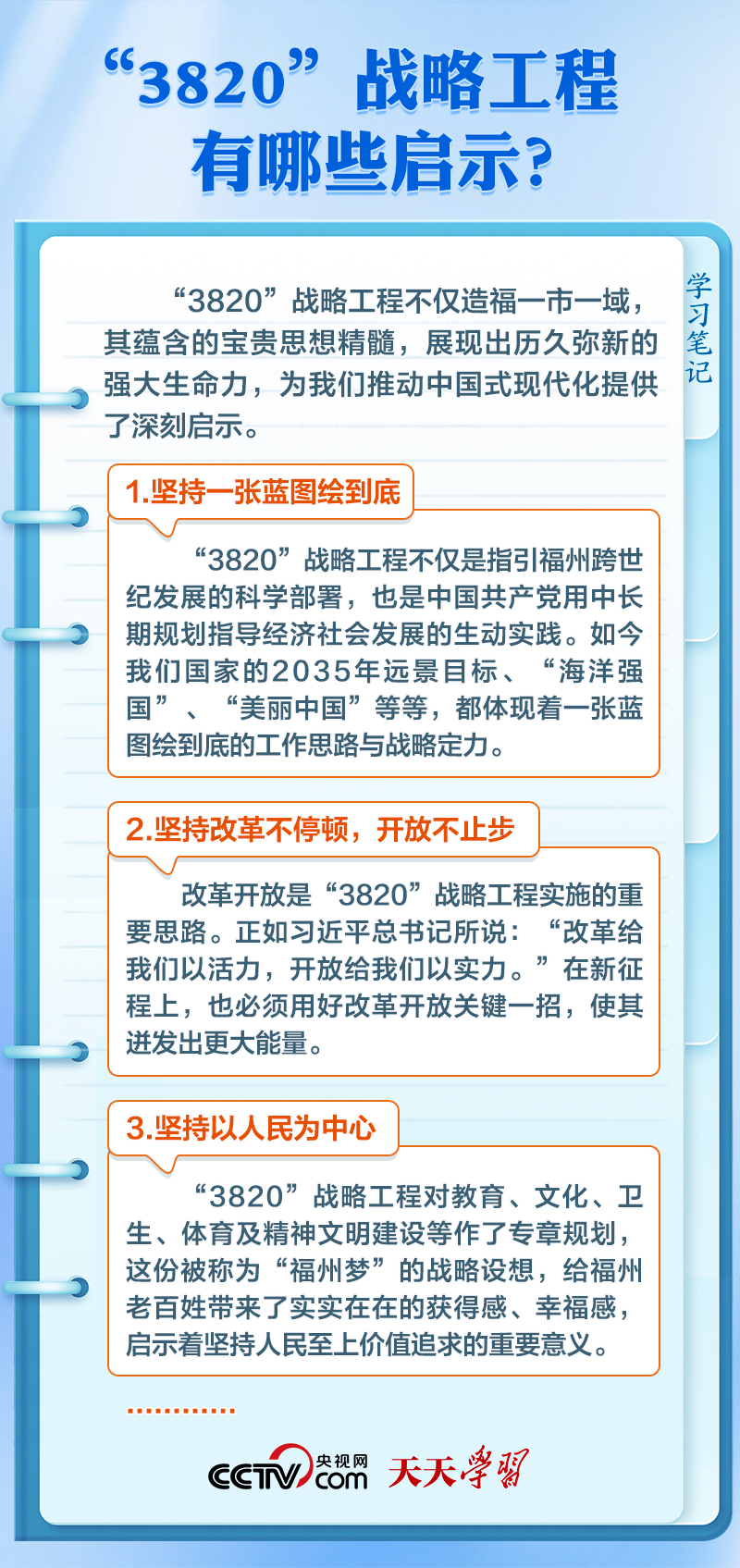 天天學(xué)習(xí)上世紀(jì)90年代,習(xí)近平在福州工作期間,親自主持編制了《福州市20年經(jīng)濟(jì)社會發(fā)展戰(zhàn)略設(shè)想》(簡稱“3820”戰(zhàn)略工程),系統(tǒng)謀劃了福州3年、8年、20年經(jīng)濟(jì)社會發(fā)展的目標(biāo)、步驟、布局、重點(diǎn)等,為福州擘畫了美好藍(lán)圖,確立了總綱領(lǐng)、總方略。