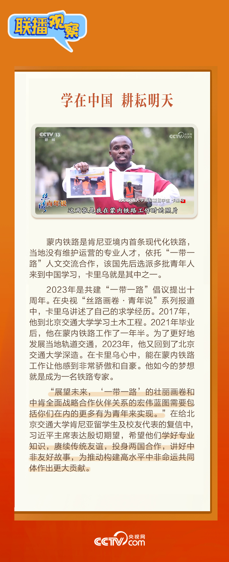 聯(lián)播+日前,北京交通大學(xué)肯尼亞留學(xué)生及校友代表致信習(xí)近平主席,表示非常高興來到中國(guó)學(xué)習(xí)鐵路運(yùn)營(yíng)管理知識(shí)。1月17日,習(xí)近平主席復(fù)信表達(dá)欣慰和喜悅之情,“蒙內(nèi)鐵路是中肯共建‘一帶一路’旗艦項(xiàng)目和成功典范。我高興地看到,你們因這條‘幸福路’與中國(guó)結(jié)緣……”