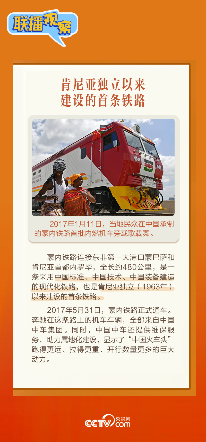 此前,習(xí)主席在外事活動(dòng)中多次提及蒙內(nèi)鐵路,《新聞聯(lián)播》也持續(xù)關(guān)注這條路的建設(shè)及開通后的運(yùn)營(yíng)情況。這條“幸福路”有何特別之處,習(xí)主席為何頻頻提及?它的建成通車給當(dāng)?shù)貛砟男┳兓??《?lián)播觀察》邀您一同了解。