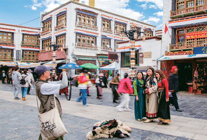 千年八廓街,見(jiàn)證民族團(tuán)結(jié)。2021年7月,習(xí)近平總書記來(lái)到位于西藏拉薩老城區(qū)的八廓街,感慨地說(shuō):“千年八廓街,是我們各民族建起來(lái)的八廓街。各民族文化在這里交流交往交融,我們中華民族的大家庭在這里其樂(lè)融融。”圖為2023年6月13日,游客身著藏裝在八廓街拍照留念。 新華社記者 姜帆/攝