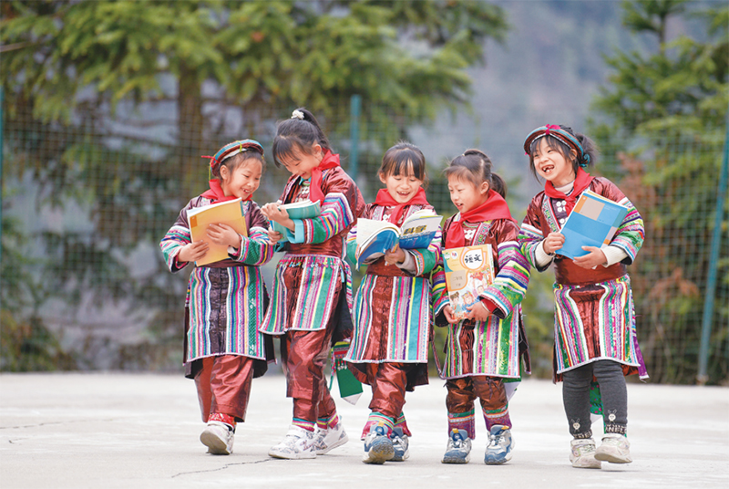 位于貴州省黔東南苗族侗族自治州從江縣大山深處的西山鎮(zhèn)中寨教學(xué)點(diǎn),是一所全校均為瑤族學(xué)生的“微小學(xué)”。近年來(lái),隨著教學(xué)條件逐漸改善,學(xué)校發(fā)生了翻天覆地的變化。圖為2023年2月16日,領(lǐng)到新書的瑤族學(xué)生在一起交流。 新華社記者 楊文斌/攝