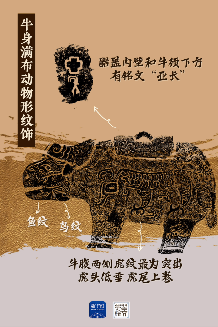??亞長牛尊是截至目前殷墟發(fā)現(xiàn)的唯一一件牛形青銅容器?!皝啞笔俏涔俚姆Q謂,“長”是家族姓氏,墓主人亞長是商王朝南部“長”國的部落首領(lǐng)。